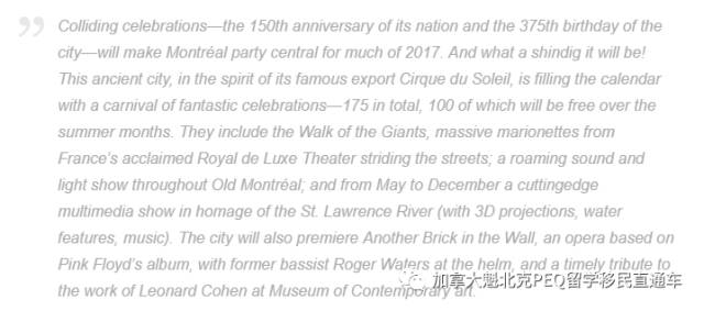 明年正是加拿大建国150周年,以及蒙特利尔建市375周年,全年都在狂欢!